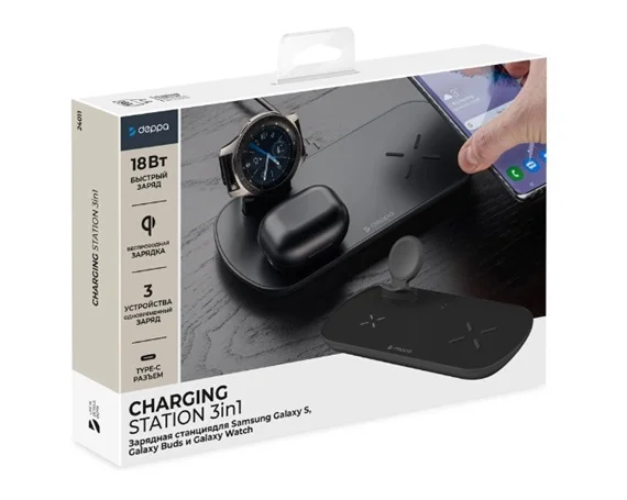 Зарядная станция Deppa Qi, Galaxy Watch, Galaxy Buds, 17,5 Вт, черная, 24011