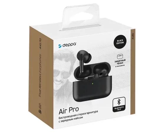 Bluetooth стереогарнитура Deppa AirPro2, зарядный футляр 300mAh, черная, 44170 в Красноярске