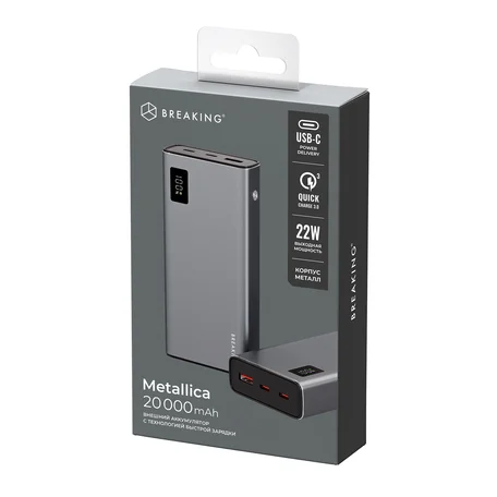 Внешний аккумулятор 20000 mAh Breaking Metallica, USB-A + 2USB-C, 22,5W, PD, QC3.0, графит, 27202