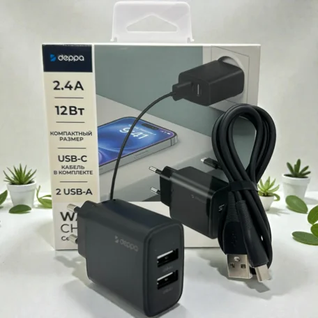 СЗУ-2USB Deppa, 2.4A + кабель USB-Type-C, 1м, черный, 11487